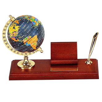 There are modern black globe and name card holder with classic pen holder and black ball pen.
