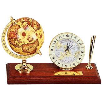 There are sailing globe and world clock with classic pen holder and black ball pen.