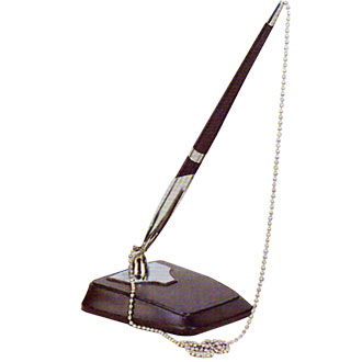 Plastic pen stand black with 60cm chrome chain and ball pen.