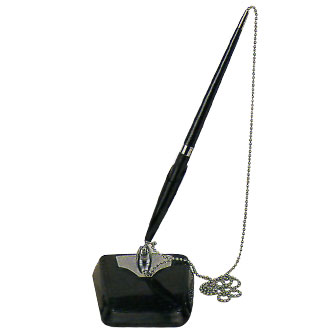 Plastic pen stand black with 60cm chrome chain and ball pen.